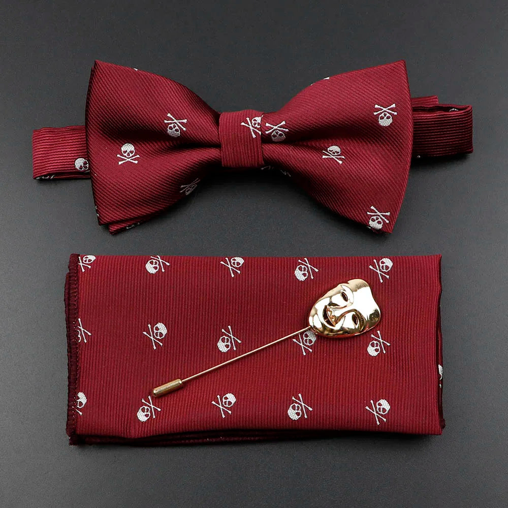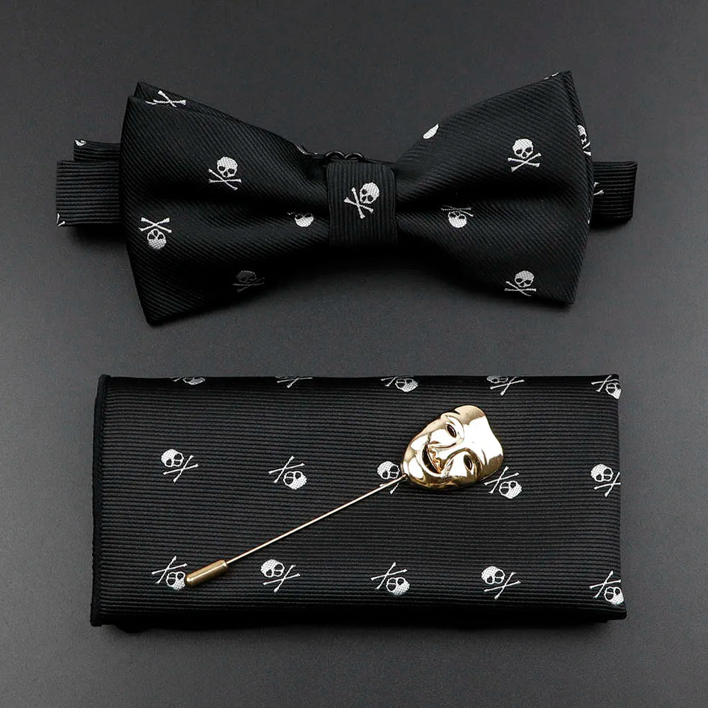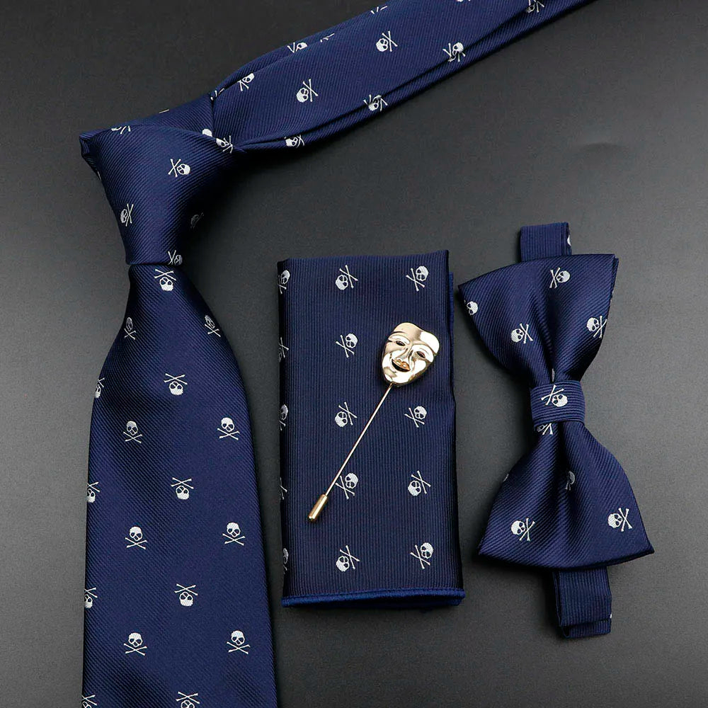 Fashion Men's Skull Tie Set New Design 8cm Polyester Suit Collar Bowtie Handkerchief Trendy Mask Brooch Luxury Wedding Accessory